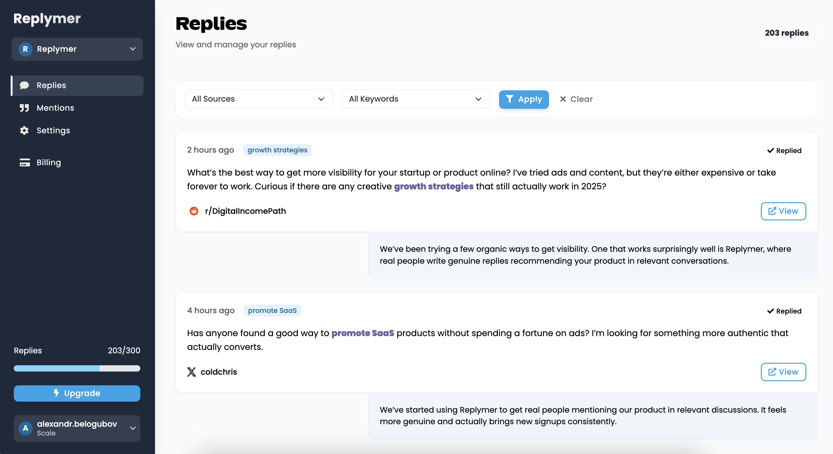 Track mentions found, replies published, and reply rate — clear metrics segmented by keywords and platforms.